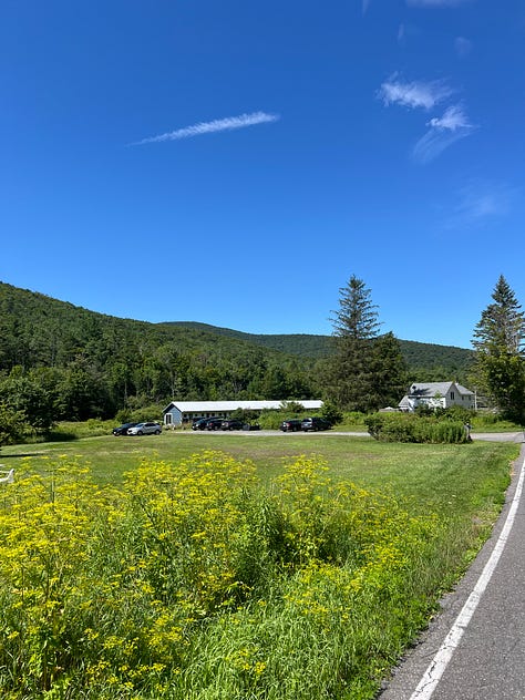 Ohhh I love this description of your time in this other world, Kate! I actually think my breath became slower and deeper as I read -- and I'm in a similar landscape right now (Green Mountains)! yet definitely not alone! as cars whiz by on Route 125, across the ridge. Here's where my own breathing started to deepen (such pleasure!): "Parts of it reminded me of Oregon and Lake Tahoe, towns getting smaller and roads getting slower. I arrived to no one. Just quiet, a key to room 5 and that sky."